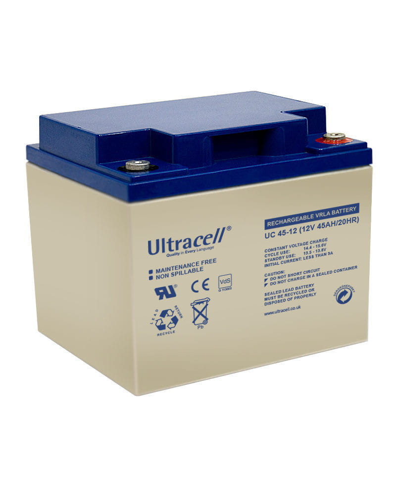 A Bateria Ultracell UC-45-12 12V 45Ah AGM , fabricada em tecnologia AGM (Absorbed Glass Mat), permite sua utilização sem perigo de derramamentos de líquidos ou emissões de gases, além de uma relação durabilidade-preço muito favorável em comparação com um modelo equivalente de chumbo-ácido.