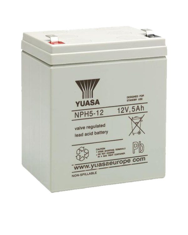 Bateria Yuasa NPH5-12 12V 5Ah é a única da Gama NPH, e é uma bateria que não necessita de manutenção nem emite gases, e que também pelas suas características físicas pode ser utilizada para brinquedos, carrinhos de golfe, UPS, ou similar.