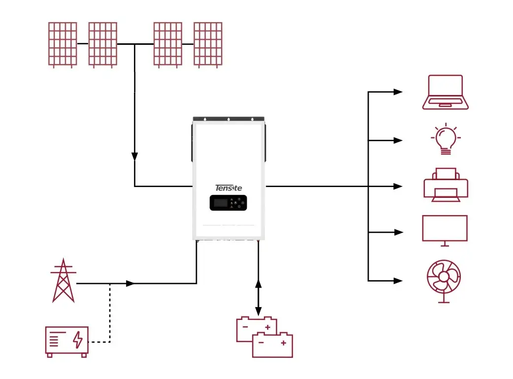 O carregador inversor Tensite 5200W 48V MPPT é um elemento chave para a instalação solar, pois é responsável pela gestão de diversas partes essenciais do sistema: o carregador inversor de onda pura 5200W, o carregador de bateria e o regulador de carga . Ao unir todas estas funcionalidades num único elemento, o funcionamento do sistema é otimizado e a sua instalação simplificada.