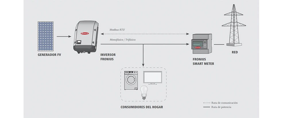 Os inversores Fronius podem ser configurados para não descarregar o excesso de produção solar na rede elétrica . Por força da legislação, se não quisermos que a energia extra produzida na instalação seja alimentada na rede elétrica, devemos adquirir o complemento Fronius Smart Meter. Graças a este medidor de energia, o inversor Fronius ECO 25kW sabe sempre quais são as nossas necessidades energéticas, para que possa adaptar a sua potência de saída ao consumo em tempo real. Isto é conseguido graças à comunicação constante do Smart Meter com o inversor Fronius.