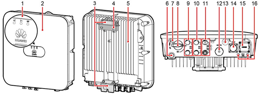 Além disso, possui conexão Wi-Fi interna , através de comunicação RS485 e indicador LED frontal, fácil de iniciar e monitorar seu funcionamento. Ele se comunica sem fio com nosso terminal móvel para que possa ser iniciado e monitorado detalhadamente. Depois de conectado à Internet, no aplicativo e portal Huawei, teremos todas as informações relacionadas à instalação.