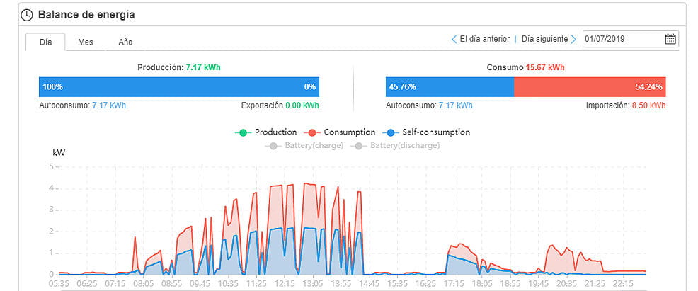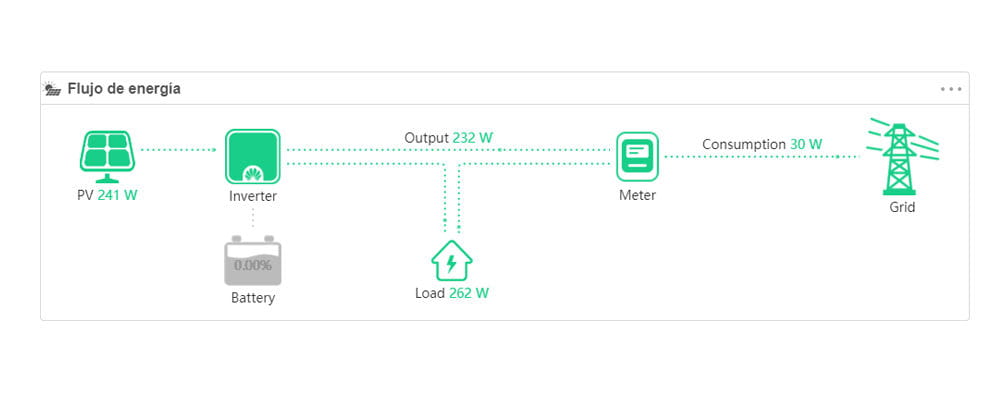 Como pode ser visto nas imagens, a aplicação Fusion Solar realiza análises detalhadas diárias, mensais e anuais dos dados de produção da instalação solar fotovoltaica e do consumo da nossa casa. Além disso, oferece um diagrama em tempo real com o fluxo de energia do sistema solar em todos os momentos.