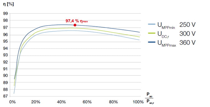 O inversor Kostal Piko 2,5-1 MP Plus 2,5kW funciona com uma corrente de saída de 10,9A nominal e máxima de 14A . A eficiência do inversor é de 96,6%.