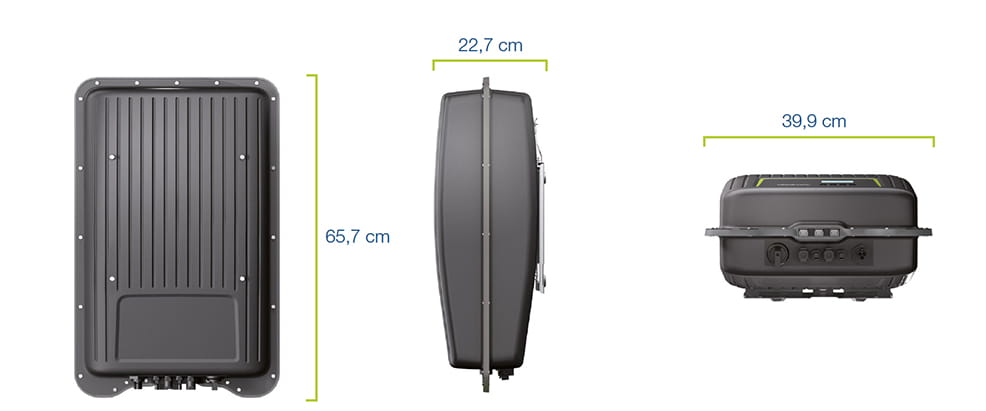O peso e as dimensões do inversor Kostal Piko MP Plus 1.5kW 1 MP fazem dele um inversor que é recomendável que você tenha os meios necessários para seu correto manuseio e instalação para evitar lesões. Especificamente, este reverso mede 657 x 399 x 222 mm e pesa 13,8 kg .