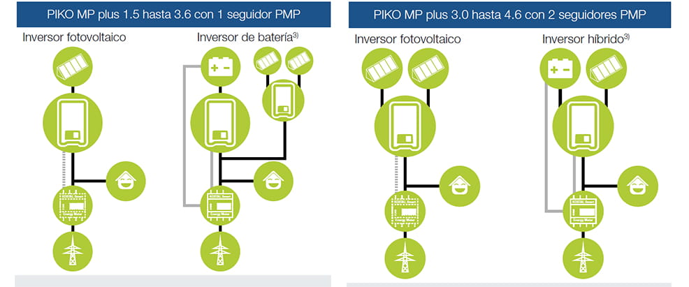 A gama de inversores híbridos Kostal Piko MP Plus apresenta grande adaptabilidade graças às suas classes de potência de 1,5 e 4,6kW, sendo por isso ideais para instalações fotovoltaicas em habitações unifamiliares , podendo ser utilizados a partir de 9 painéis solares . A estabilidade de produção desta linha de inversores e sua ampla faixa de tensões de entrada permitem múltiplas possibilidades de conexão de módulos fotovoltaicos .