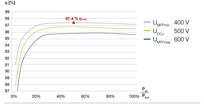 O inversor Kostal Piko 4.6-2 MP Plus 4.6kW funciona com uma corrente de saída nominal de 20A que corresponde à sua potência máxima de saída. . A eficiência do inversor é de 96,9%.