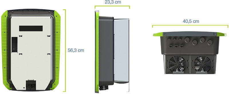 O peso e as dimensões do Inversor Kostal Plenticore Plus 5,5kW fazem dele um inversor que é recomendável que você tenha os meios necessários para seu correto manuseio e instalação para evitar lesões. Especificamente, este inversor mede 563 x 405 x 233 mm e pesa 19,6 kg .