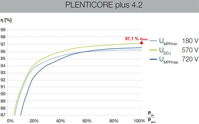 O inversor Kostal Plenticore Plus de 5,5kW é capaz de trabalhar com uma potência fotovoltaica nominal de saída de 5,67kW e com uma potência máxima de 8,25kW proveniente de energia fotovoltaica . É um inversor que opera na faixa de tensão entre 120 e 1000V . Como mencionamos anteriormente, o inversor incorpora três reguladores de carga MPPT , onde cada um deles tem uma potência nominal diferente dependendo de quantos seguidores utilizamos.