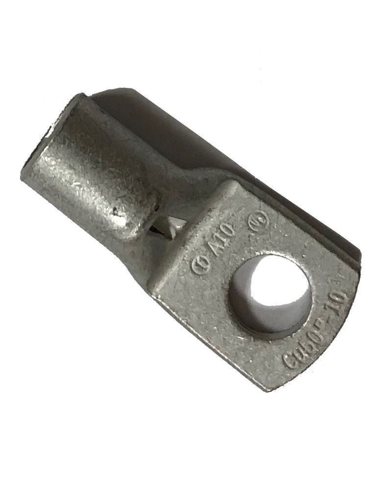 terminal de olhal de cabo de 50 mm – olhal de 10 mm está preparado para uso com fiação de seção de 50 mm e para um parafuso de 10 mm de diâmetro. É um terminal ocular durável preparado para suportar altas temperaturas, erosão e umidade. Sua grande vantagem é oferecer o melhor contato elétrico para realizar uma junta que resista a qualquer condição. Certifique-se de crimpá-lo corretamente, retire o revestimento do cabo o suficiente para poder inserir todo o cobre do cabo até a parte inferior e, em seguida, cubra-o com uma capa termorretrátil.